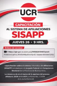 En el marco del proceso de apertura afiliatoria 2026, la Unión Cívica Radical de la Provincia de Buenos Aires llevará adelante una jornada de capacitación sobre el sistema informático de afiliaciones (SISAPP), una herramienta central para el fortalecimiento de la vida interna partidaria.